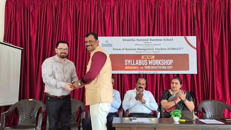 A one-day workshop was attended by Mrs. Archana Gadde, HOD of Commerce and Management, and Mrs. Deeksha Harish Jeppu, Assistant Professor. The workshop was conducted to discuss teaching the III Semester BBA papers as per the SEP syllabus at Swasthika International Business School, Mangalore.
