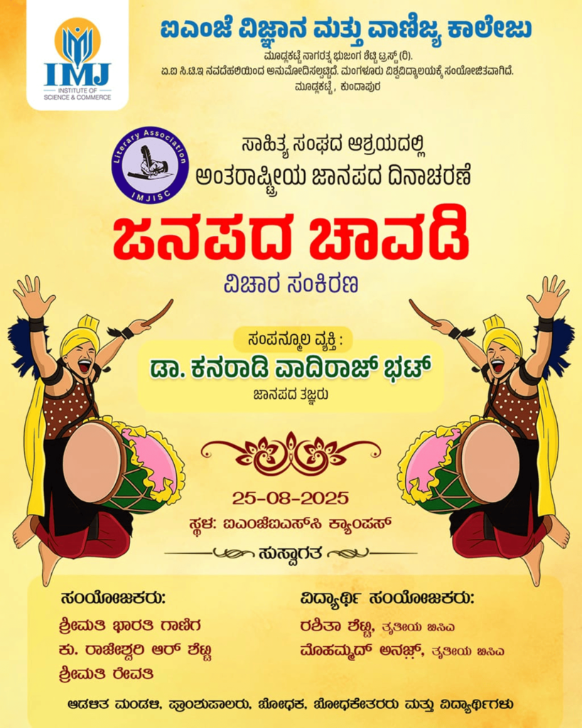 Organised by Literary Association Resource Person – Dr. Kenarady Vadiraj Bhat , Folklore Scholar. Janapada Chavadi – Vichara Sankirana is an academic and cultural forum dedicated to the study, discussion, and dissemination of folk traditions, indigenous knowledge systems, and critical thought. The programme encourages intellectual dialogue through lectures, interactions, and interdisciplinary perspectives rooted in Janapada (folk) studies.