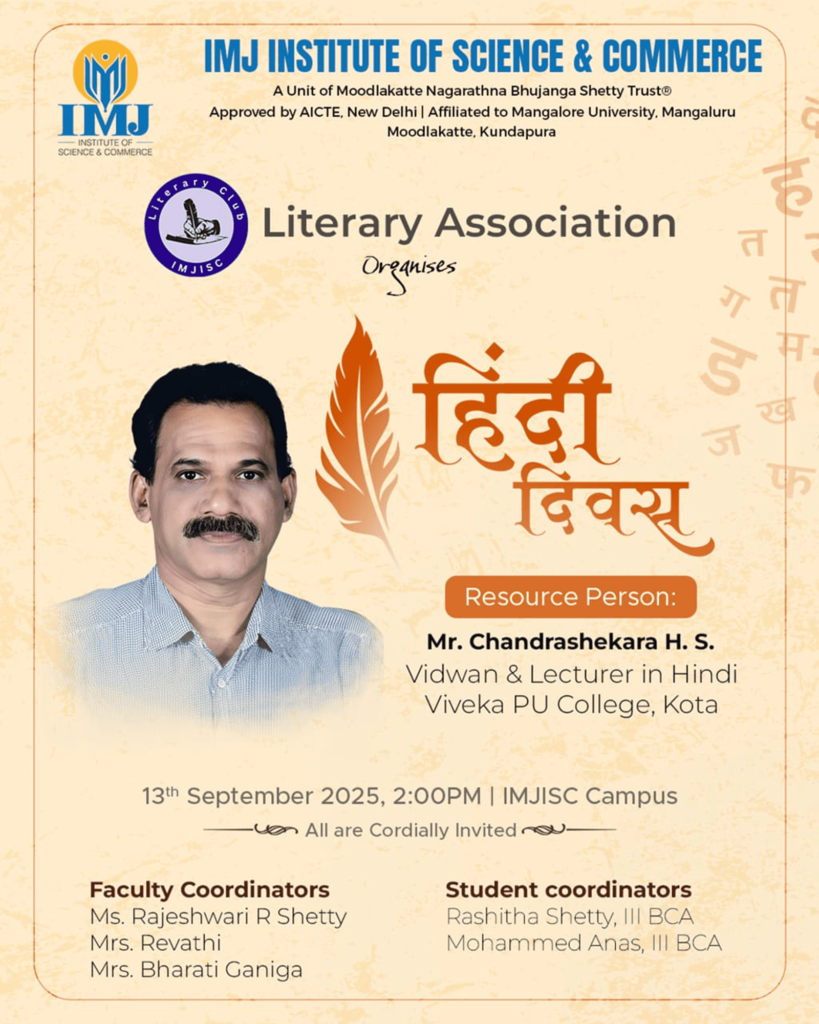 The resource person for the programme was Mr. Chandrashekar H. S., Vidwan and Lecturer in Hindi. The National Hindi Diwas Celebration was organized to highlight the significance of Hindi as a unifying language that connects diverse cultures, traditions, and emotions across the nation. The programme emphasized the role of language in fostering national integration, cultural harmony, and effective communication. It also encouraged students to appreciate and promote Hindi as a powerful medium.