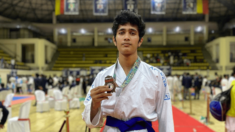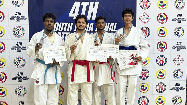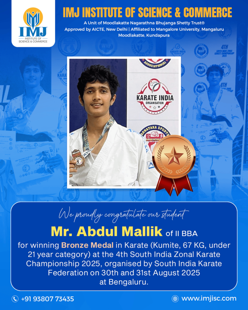Our student, Mr. Abdul Mallik of II BBA, won the Bronze Medal in Karate (Kumite – 67 kg, Under-21 category) at the 5th South India Zonal Karate Championship 2025, organized by the South India Karate Federation, held in Bengaluru.