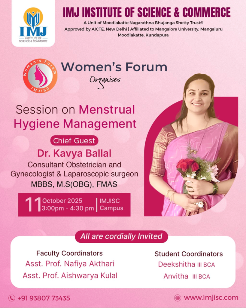 Organised by Women’s Forum. Resource Person Dr. Kavya Ballal Designation Consultant Obstetricia and Gynecologist & Laparoscopic Surgeon MBBS, M.S(OBG), FMAS . A session on Menstrual Hygiene Management was conducted to create awareness about menstrual health and hygiene. The session educated students on the importance of proper hygiene practices, health care, and breaking myths related to menstruation. It was informative and helped promote health, confidence, and well-being among students.