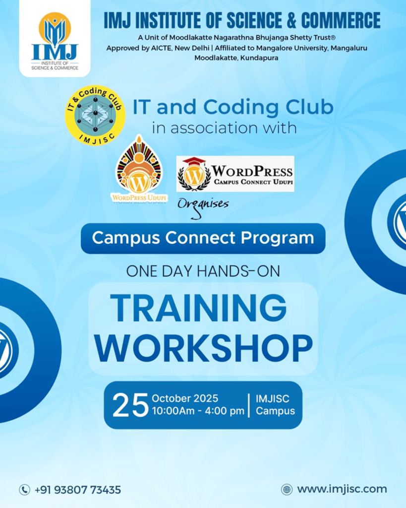 Organised by: IT & Coding Club Resource Persons: Mr. Manjunath M. M., Mr. Shashikanth Shetty, Mr. V. Gautham Navada, Mr. Omkar Udupa, Ms. Chandana G. M. The IT & Coding Club, in association with WordPress Campus Connect Udupi, organised a one-day hands-on training workshop. Resource persons guided students through practical sessions, enhancing their skills in WordPress development and web design.